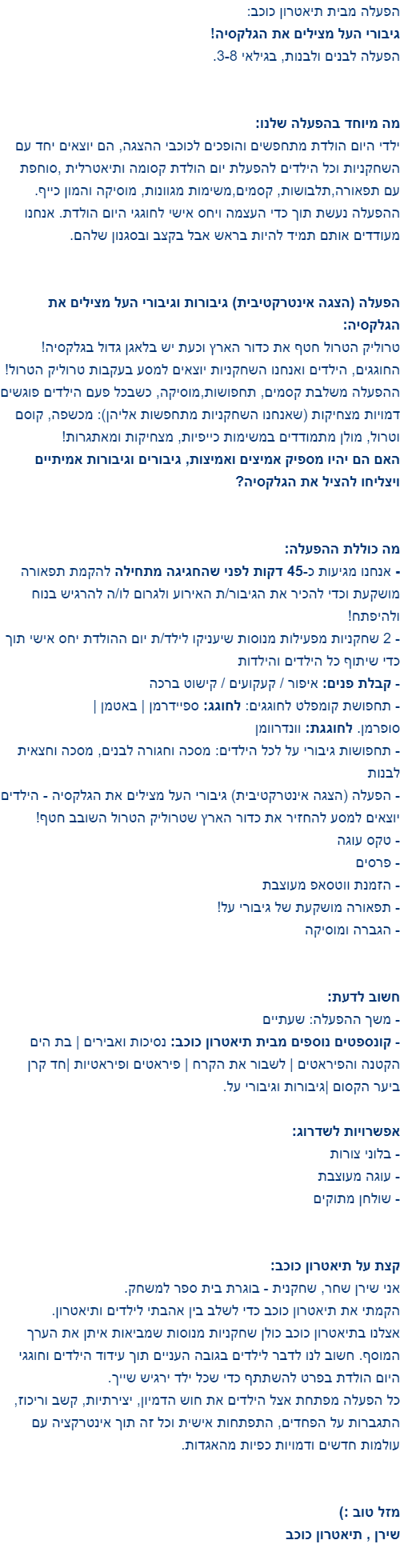 שירן תודה על יום הולדת מושללללם!! הילדים נהנו מאוד ואת מקסימה ומדהימה! יש לך סבלנות בלתי נגמרת וגישה נפלאה עם ילדים. ממליצה על תיאטרון כוכב בחום