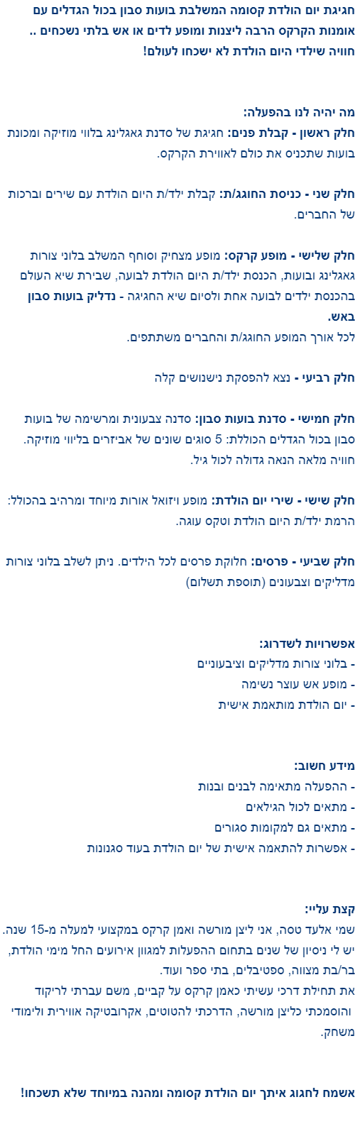 אלעד היקר אני רוצה שוב להודות לך על יום הולדת מושלמת! זו פעם ראשונה שחגגנו ללני עם ילדי הגן ופעם ראשונה שהזמנתי מפעיל ואני כל כך שמחה על הבחירה בך שעמדה בכל הציפיות ואף מעבר לכך! לא פשוט לרתום אליך הרבה ילדים ולהשאיר אותם מרותקים לאורך כל הפעילות ועשית את זה בצורה מדהימה! ההורים לא הפסיקו להחמיא לך תוך כדי הפעילות וגם לאחר מכן שלחו לי הודעות פרגון! הילדים היו בעננים שמחו צחקו ונהנו מכל רגע! באמת שהיה מושלם! אין לי ספק שעוד נתראה! תודה רבה וכמובן כל המלצה שאתה צריך אתה יכול להפנות אליי בשמחה! ענת.