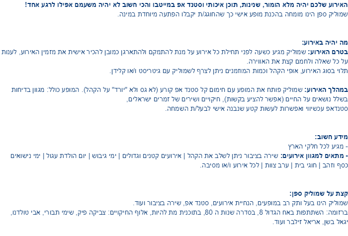 אין מילים לתאר את הערב המיוחד שארגנה לכבוד יום הולדת ה-70 של בעלי היקר המופע היה מצחיק ותואם לקהל כולם נהנו וצחקו המוזעקה היתה מעולה כל הכבוד לך הבחירה שלי היתה טובה נשמח להמליץ בחום