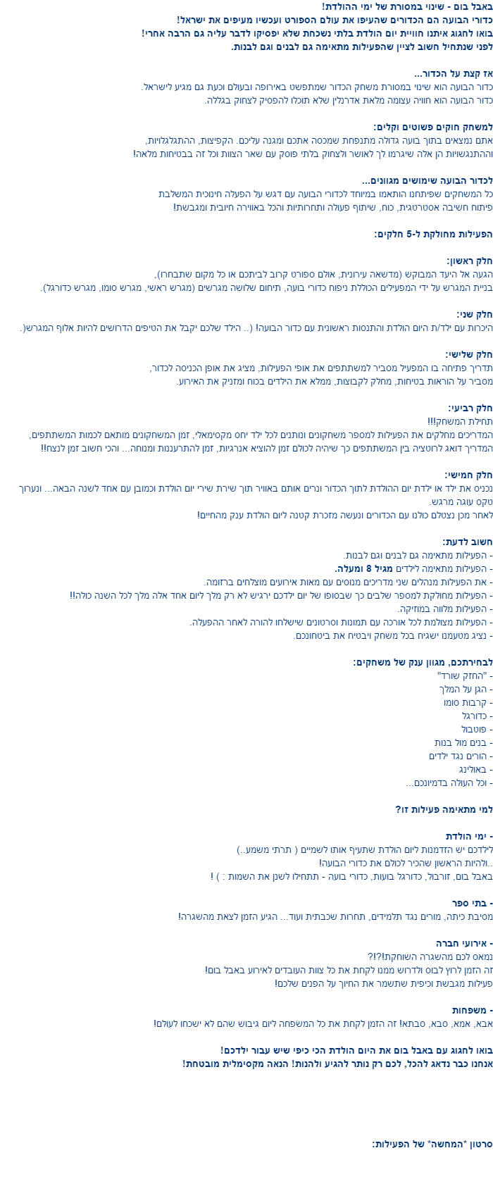 את האמת...שווה כל שקל! הייתה פעילות משוגעת,קצב טוב,מוזיקה,גלגולים וצחוקים בלתי נפסקים! תודה רבה לבאבל בום על הפעלה מושלמת!